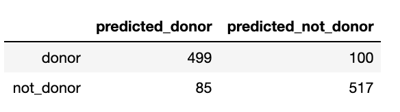#transform confusion matrix into array #the matrix is stored in a variable called confmtrx confmtrx = np.array(confusion_matrix(y_test, preds)) #Create DataFrame from confmtrx array #rows for test: donor or not_donor designation as index #columns for preds: predicted_donor or predicted_not_donor as column pd.DataFrame(confmtrx, index=['donor', 'not_donor'], columns=['predicted_donor', 'predicted_not_donor'])